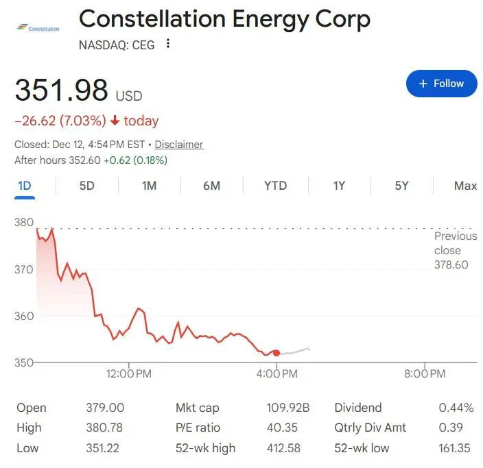 抛售潮以致延伸至能源板块,ConstellationEnergy、Vistra、GEVernova和Cummins等电力相干股票均跌。核电巨头Constellation收跌7%。