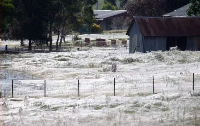 维多利亚州的大水事后,数百万只蜘蛛在乡村布满蜘蛛网,试图爬到地势较高的场地:图源:Jeff Hobbs