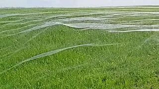 新西兰公园的草地上隐敝着一层透明的蜘蛛网。图源:Tracey Maris/Storyful